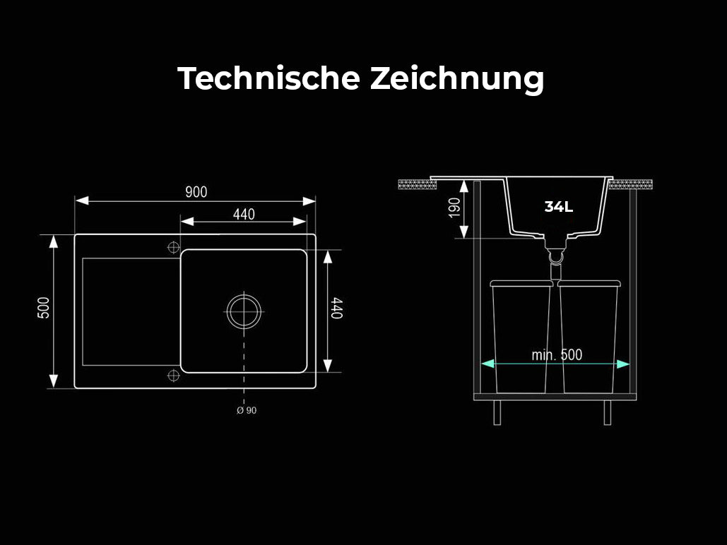 Zlewozmywak Kuchenny Granitowy - Cordeo XL - 90 x 50 cm