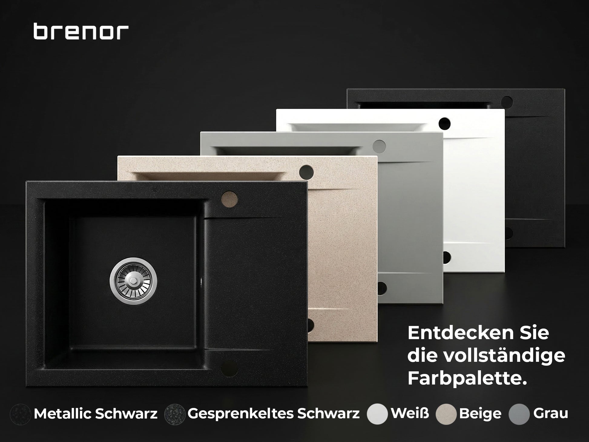 Zlewozmywak w kolorze czarnym nakrapianym jest całkowicie matowy i posiada gęste nakropienia w odcieniach szarości. Modele w kolorze czarny metalik wyróżniają się głęboką czernią z drobinkami srebrnego brokatu, które mienią się w zależności od światła.