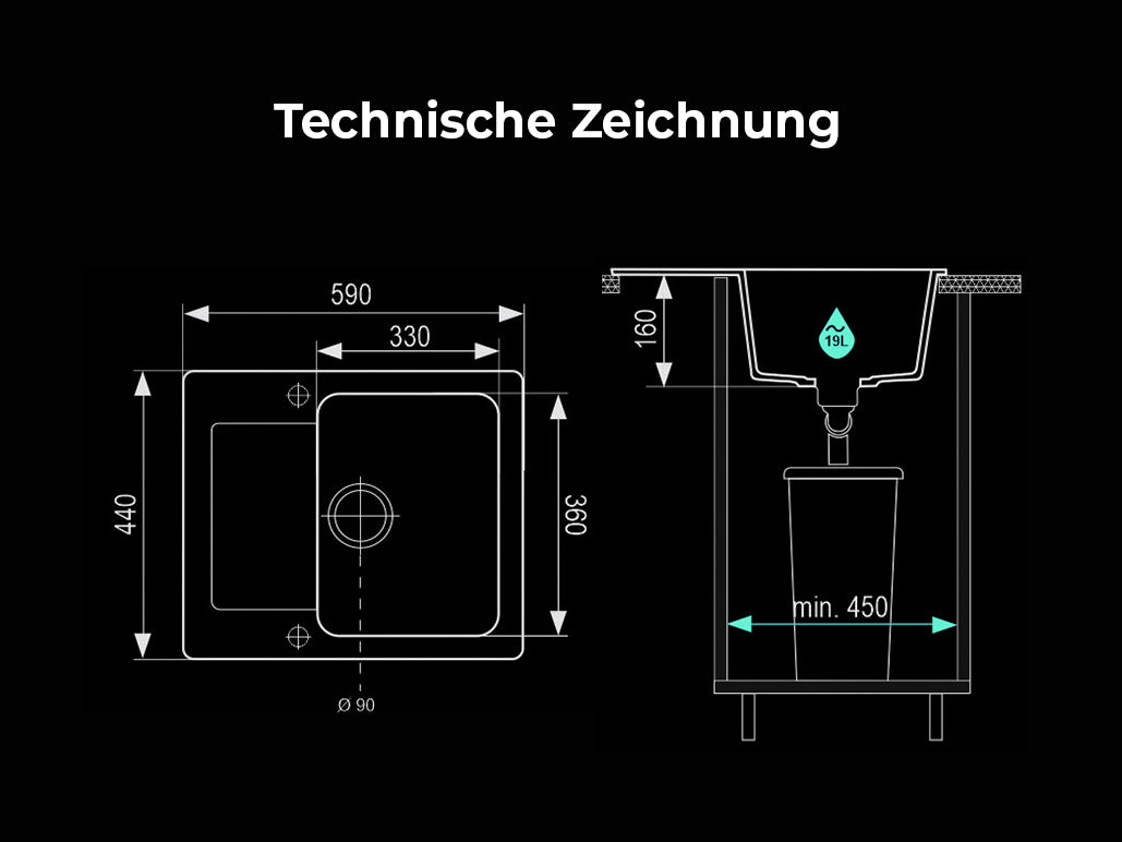 - Wymiary zlewozmywaka: 59 x 44 cm