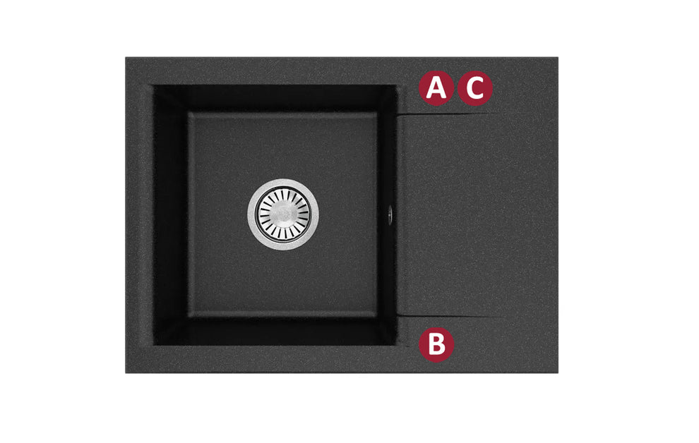 Otwory w zlewozmywakach należy określić za pomocą liter, zgodnie z oznaczeniem wedle zdjęcia w ofercie. Przykładowo: potrzebują Państwo jeden otwór w zlewozmywaku, więc należy dopisać informację do zamówienia ,,otwór A„ itd.Przy wyborze trzechotworów ,(dwa na górze i jeden na dole), w przypadku modeli zociekaczem, konieczne jest określenie jego strony.